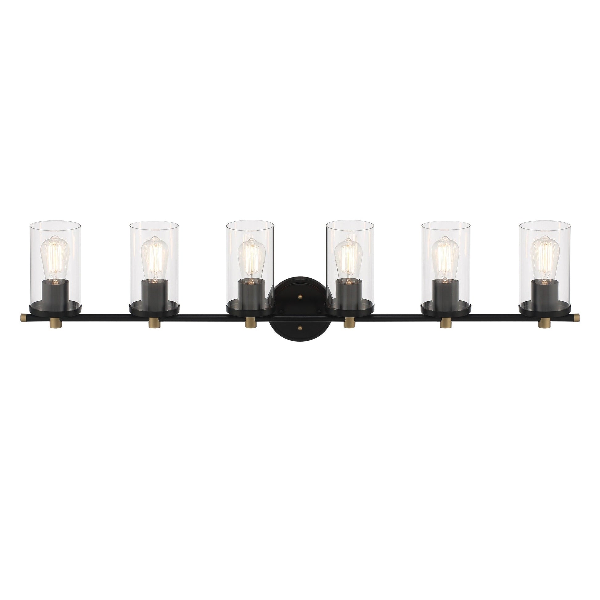 Add a touch of modern farmhouse to your bathroom with the 6-light Vanity Light. Made of premium quality steel and hand-blown glass, features damp UL listed to ensure safety and durable. Black in finish decorated with brass in some detail, this bathroom light fixture is perfect for modern, transitional, and farmhouse styles. 6 lights designed can illuminate a large space as bath, entryway, and kitchen.